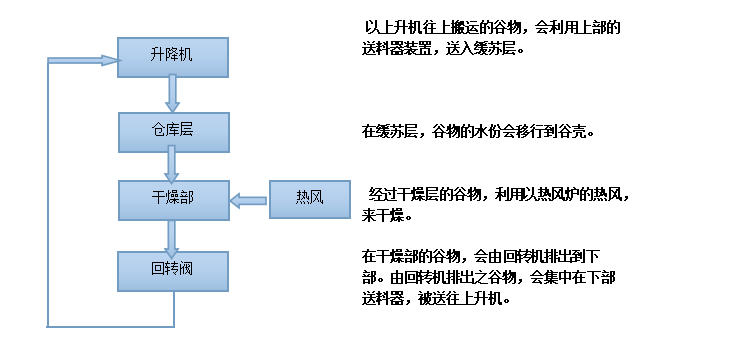 上升機往上搬運的谷物,會利用上部的送料器裝置,送入緩蘇層。 在緩蘇層,谷物的水份會移行到谷殼。經(jīng)過干燥層的谷物,利用以熱風爐加熱的熱風,來干燥。在干燥部的谷物,會由回轉(zhuǎn)機排出到下部。由回轉(zhuǎn)機排出之谷物,會集中在下部送料器,被送往上升機。